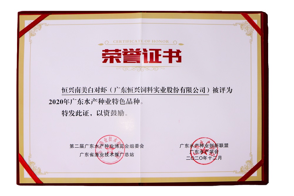 2020年廣東水產(chǎn)種業(yè)特色品種(南美白對蝦)榮譽證書