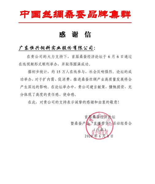 6月8日,中國絲綢桑蠶品牌集群給公司發(fā)來了感謝信: