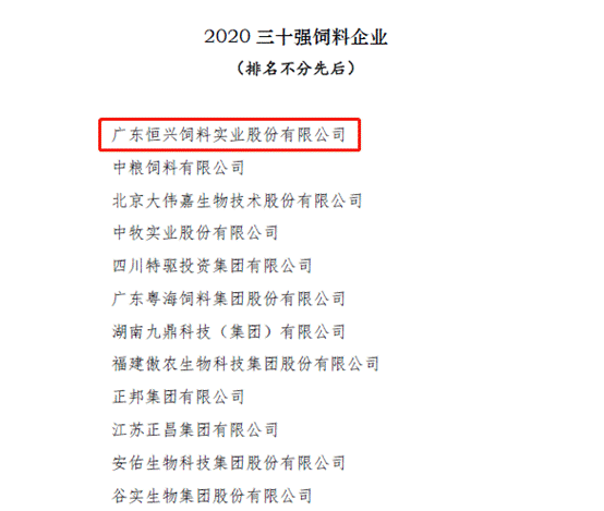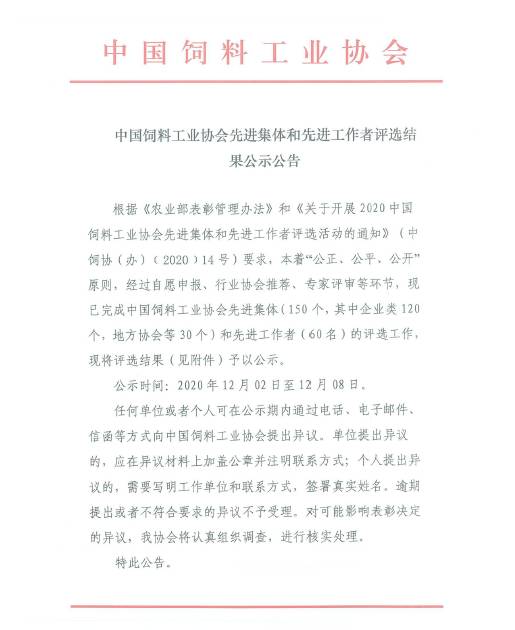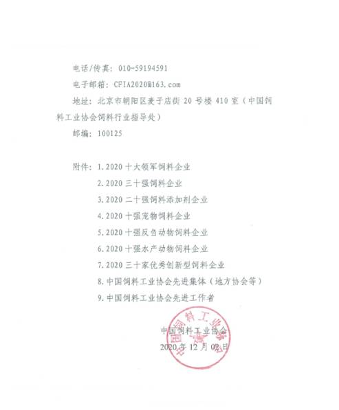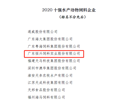 2020年12月2日,公司被中國飼料工業(yè)協(xié)會評為“2020三十強(qiáng)飼料企業(yè)”、“2020十強(qiáng)水產(chǎn)動物飼料企業(yè)”。