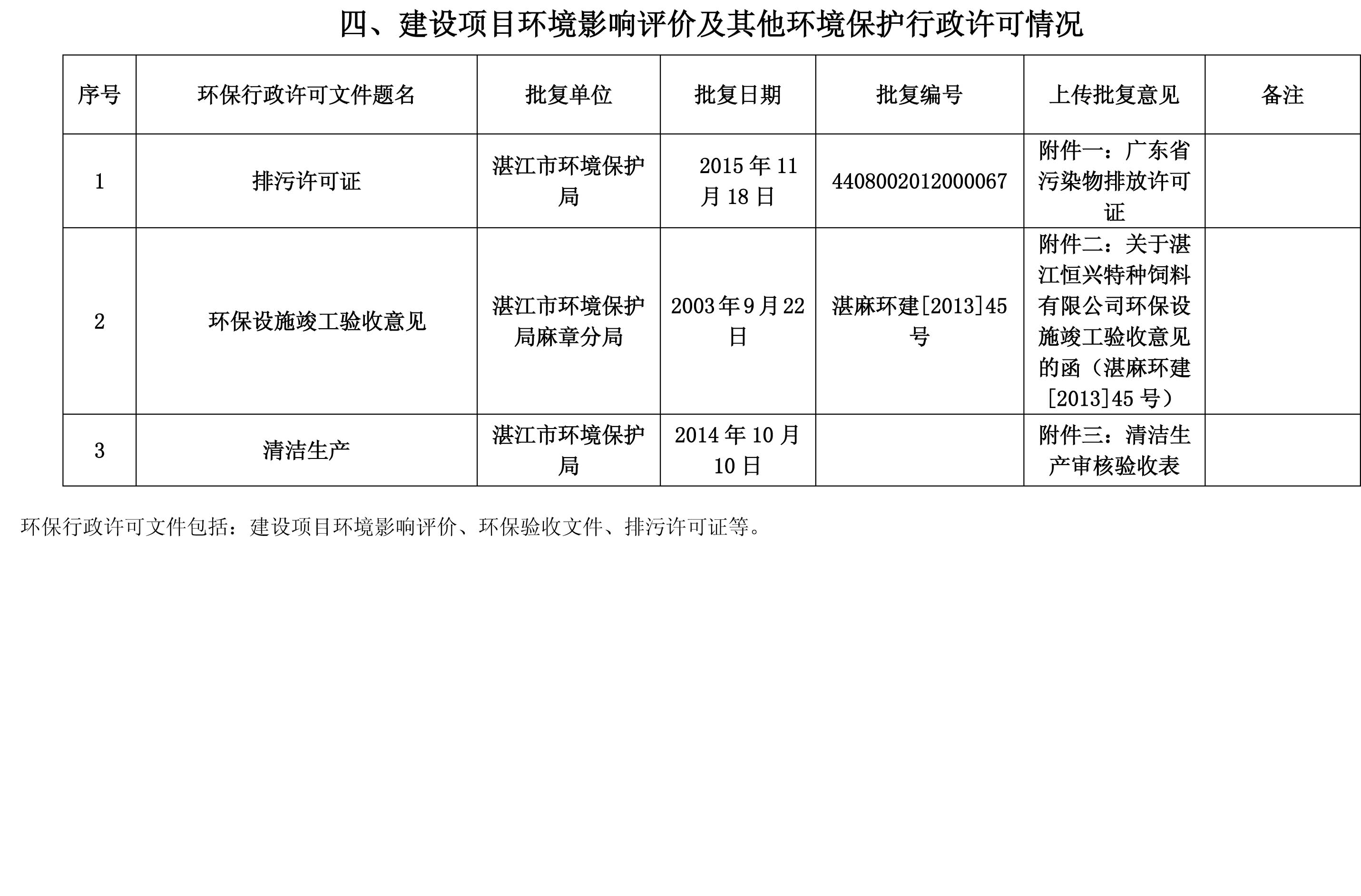 附件一:(廣東省污染物排放許可證)--1 特種排污許可證正本2015.11.18.pdf 附件一:(廣東省污染物排放許可證)--2 特種排污許可證副本2015.11.18.pdf 附件二:湛麻環(huán)建[2003]45號關于湛江恒興特種飼料有限公司環(huán)保設施竣工驗收意見的函.pdf 附件三:清潔生產審核驗收表.pdf 附件四:湛江特種突發(fā)環(huán)境應急預案備案表.pdf